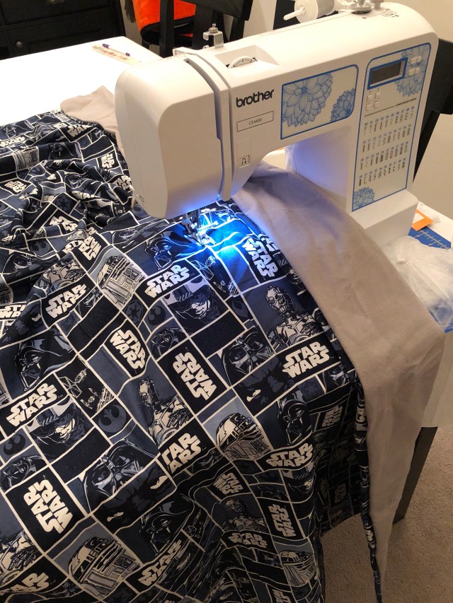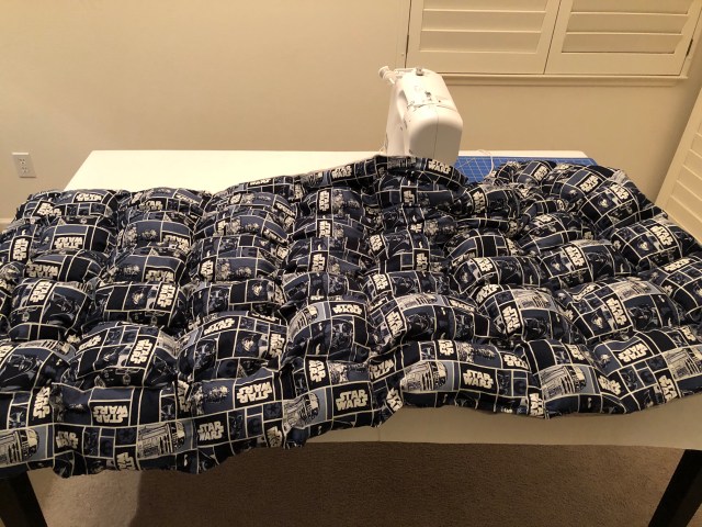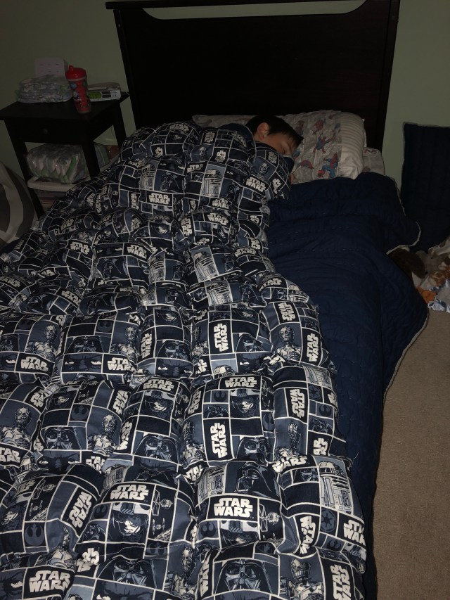 Poppa Bear bought me a sewing machine years ago and I’ve never really used it. I’ve read about weighted blankets and decided I’d give one a try for Young Jedi. I opted for making one a) because I love getting crafty and b) because those things get pricey. Plus I could let Young Jedi pick his fabric. Desperate times call for desperate measures. So I put on my big girl pants and decided to give it a try. I must say, it was very therapeutic to sew at the end of a long day of cleaning and painting. The lines are definitely not straight and I didn’t divide my weights up evenly enough so I can improve on the next one. The jury is still out on whether it works or not, his sleep is still kind of all over the board. Some weeks he sleeps 3 nights in a row. Other weeks he’s up 3 times a night. All I know is it’s absolutely killing me and I look horrible and old from it! I’m not sure if it’s not fully working because my weights are uneven or he’s just destined to be the death of me but we’re sticking with it.