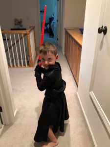 Young Jedi was in heaven yesterday on Star Wars day (while I was in heaven today with margaritas and chips and guacamole, but I digress). I took away most of his Star Wars dress up and light sabers recently because of behavior. He gets in his Star Wars mode and the dark side is too much to handle. But his Kindergarten teacher loves Star Wars as much as he does and she urged me to have him go all out for May the Fourth day. So I took down his Kylo Ren outfit and his light saber and sent him to school hoping the force was with his teacher that day!