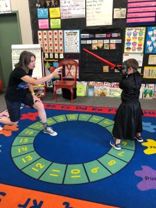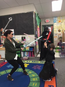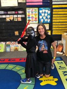 Young Jedi pretty much had the best day ever! Like it probably compared to Jedi Training Academy day. Like he was up with teeth brushed (which we usually fight over) by 7:00 am in full Kylo Ren garb. He stayed in his costume all day despite it being 85 degrees, even at recess. His teacher arranged for his old principal to come dressed as Darth Vader. Young Jedi got to have a light saber battle with his old principal and vice principal. I think this is so fantastic. I don’t think we’ll ever, ever have such interactive amazing administrators and teachers (I know I never did growing up!) as we currently do. This is the part of moving that makes me really sad. Despite getting denied his IEP, the administration knows and loves Young Jedi for who he is. I know they want what’s best for him, I really do. They and his teacher embrace his complete love for Star Wars and go with it and have fun. In return he respects them and wants to please them. His vice principal has become his safe zone this year. It is more than I could have ever asked for from a school. It’s been a rough year but know having his teacher and the administrators behind him, has made the really hard days manageable.