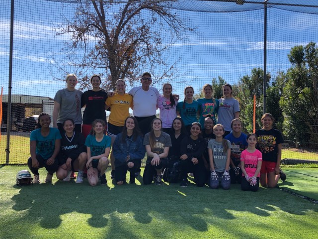 Naturally we were late because when the 4 of us are together we can’t seem to get it together and get out of the door. All of the other girls had warmed up and as Sporty was getting ready to warm up, he stops the machine and introduces the 5 college players that were there. Then he walks over to Sporty and gives her an introduction to all of the players and parents as she is the youngest player that he has ever taken and she struggled when she started but how far she’s come. It was really awesome recognition for her. After 3 warm up swings, the competition began.